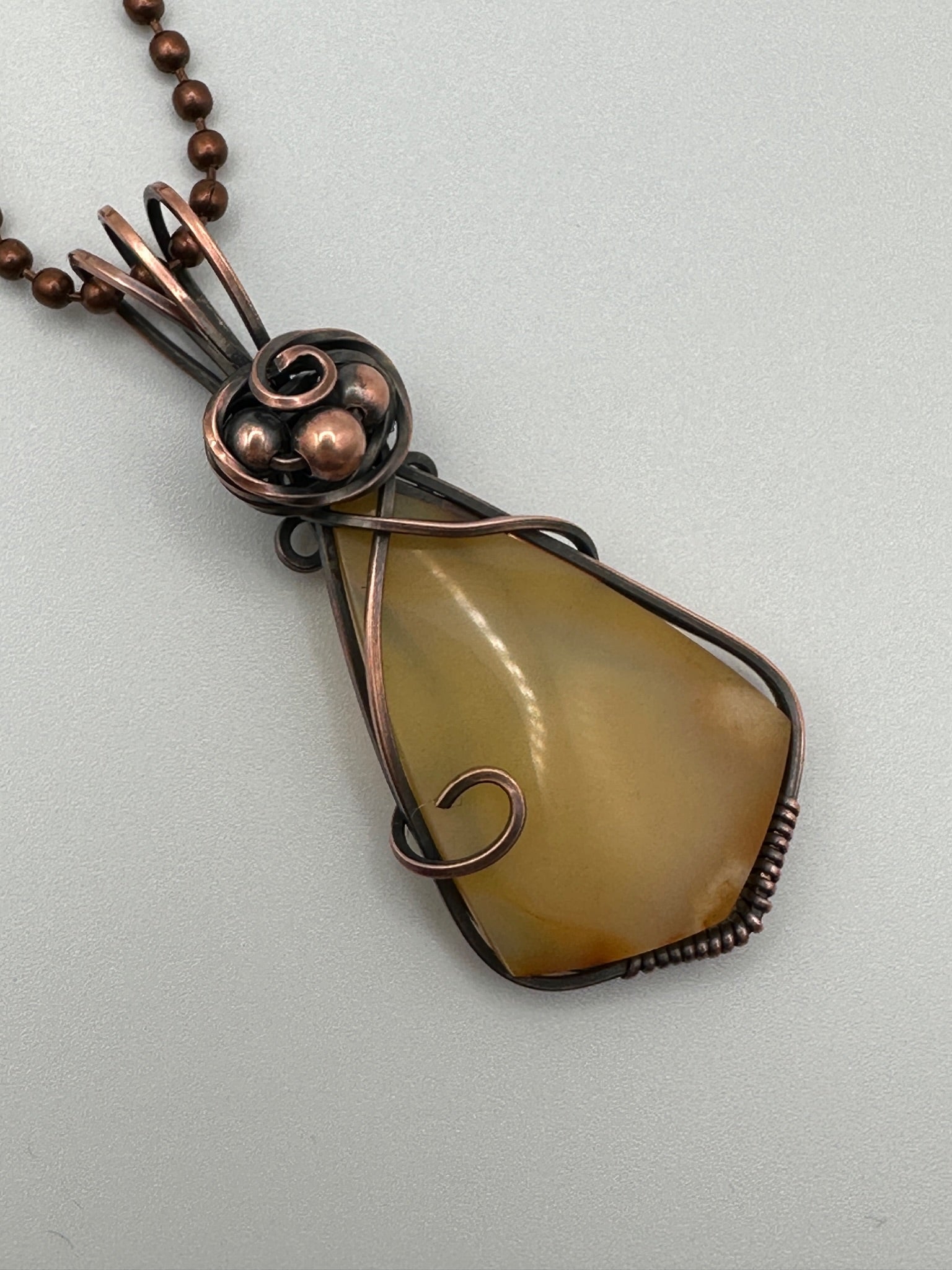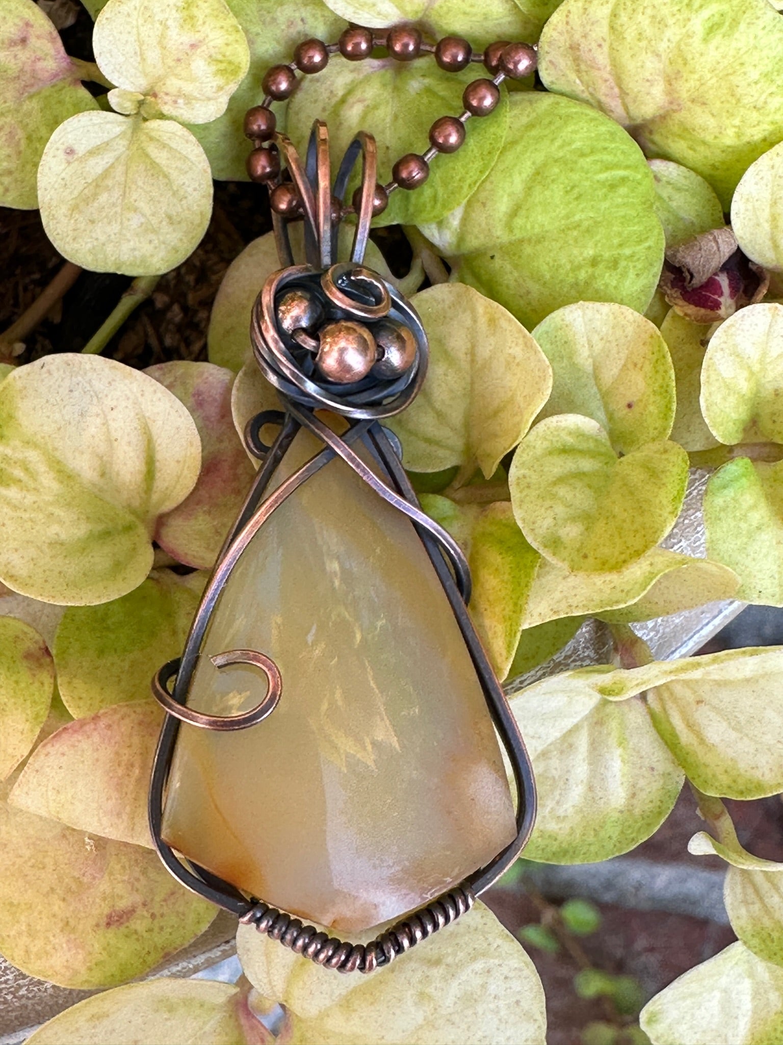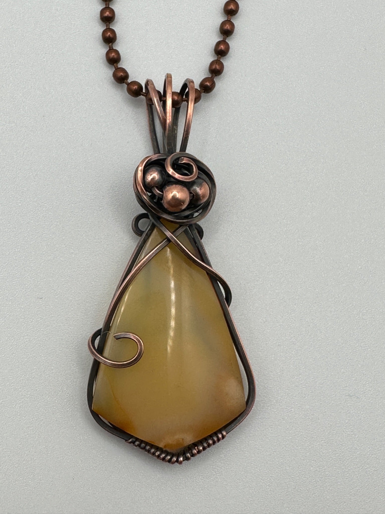 Amber Chalcedony Pendant wrapped in oxidized copper wire to give it an antique look. Pendant is 2 inches tall and 1 inch wide. Comes with a free 18 inch chain!