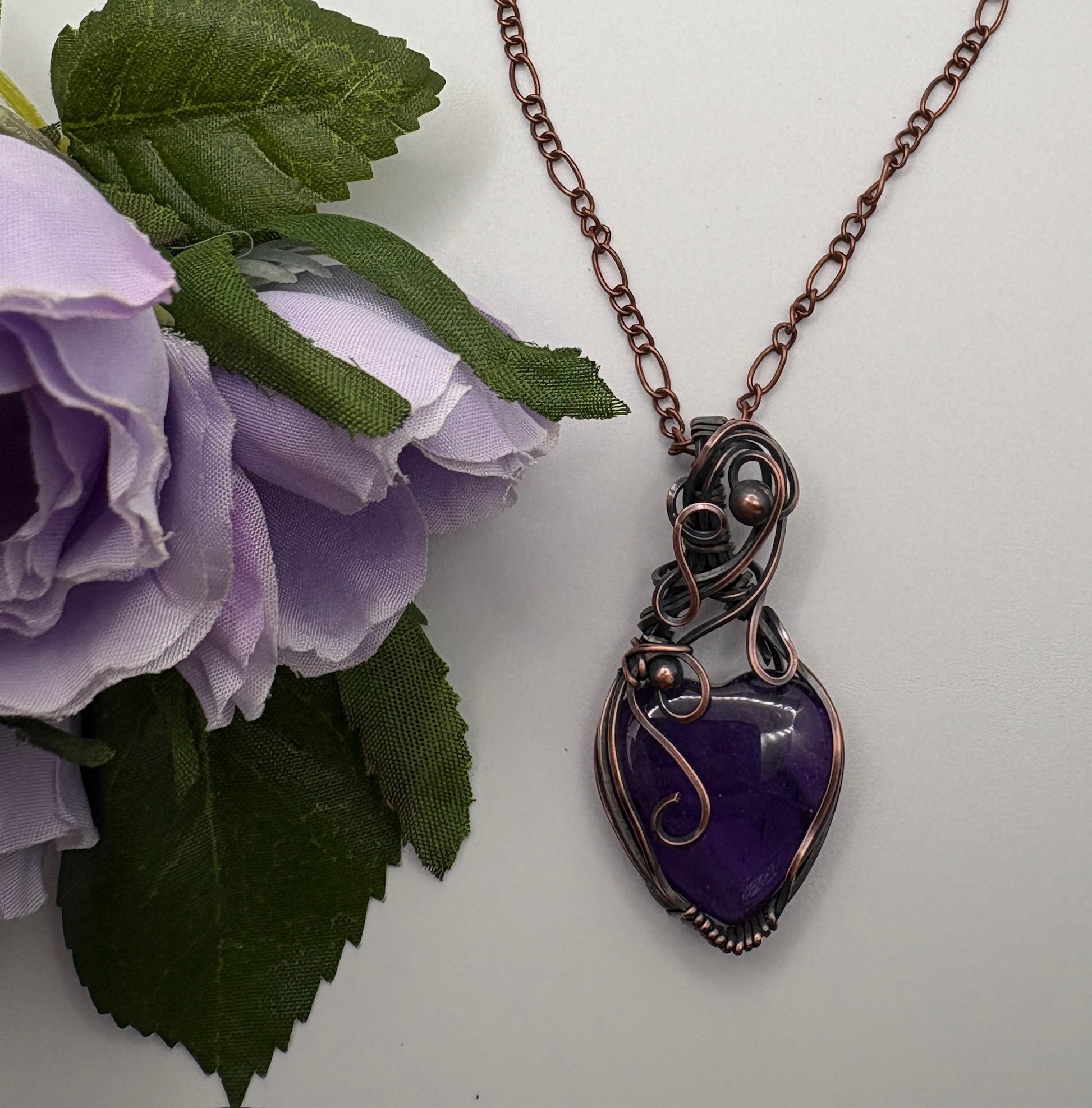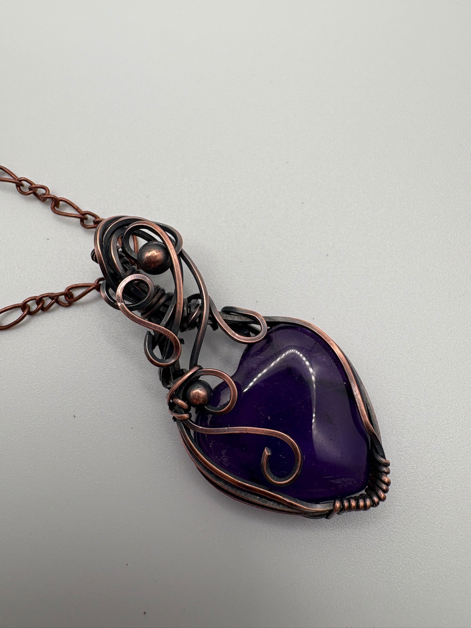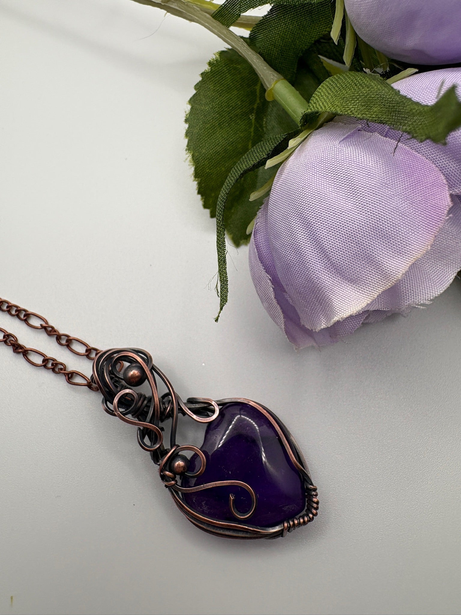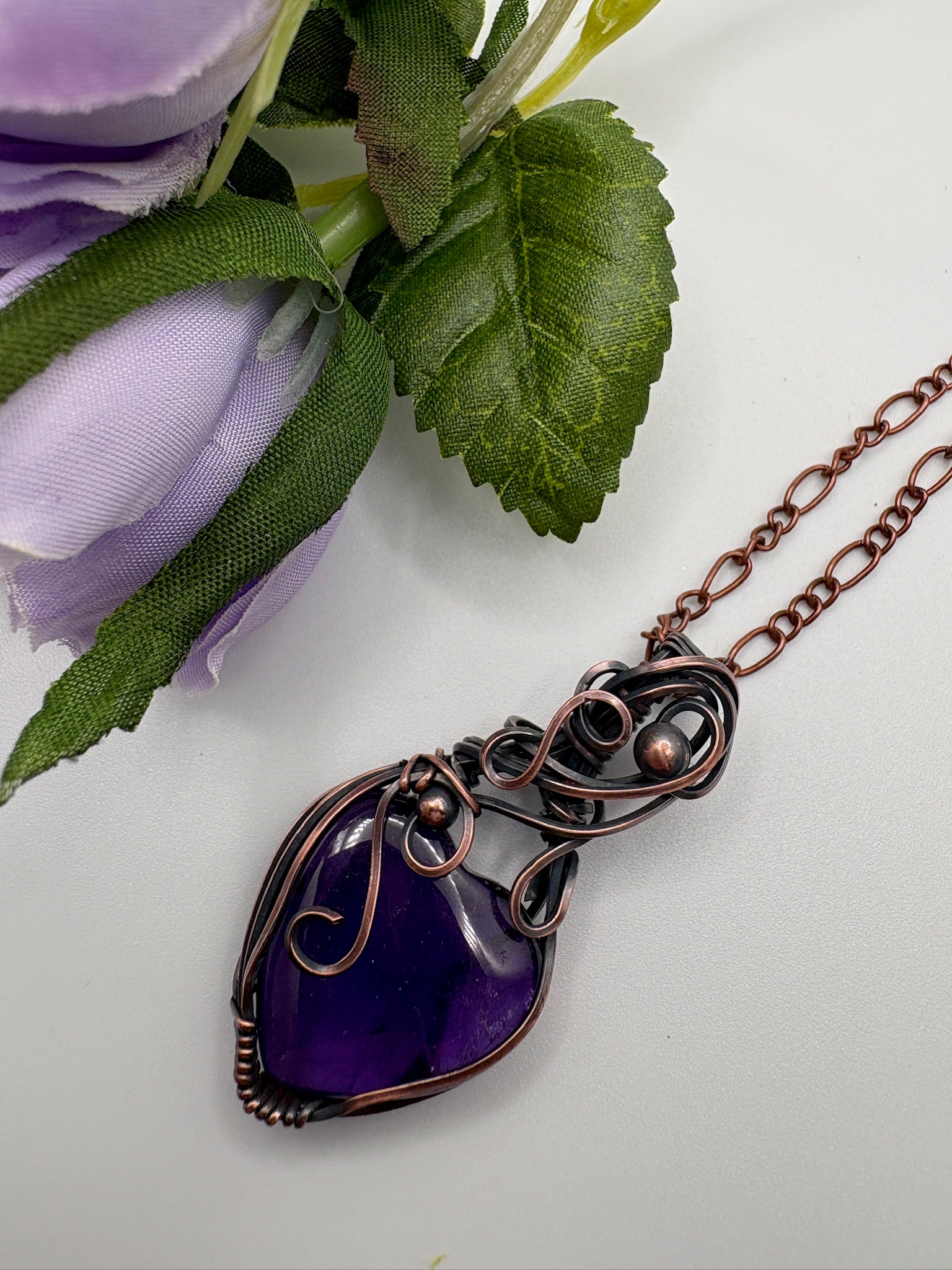 Amethyst heart shaped stone wrapped in swirly oxidized copper wire and adorned with copper beads. A gorgeous and simple design to upgrade any outfit! The pendant is 1.75 inches tall and .75 inches wide. It comes with a free chain!