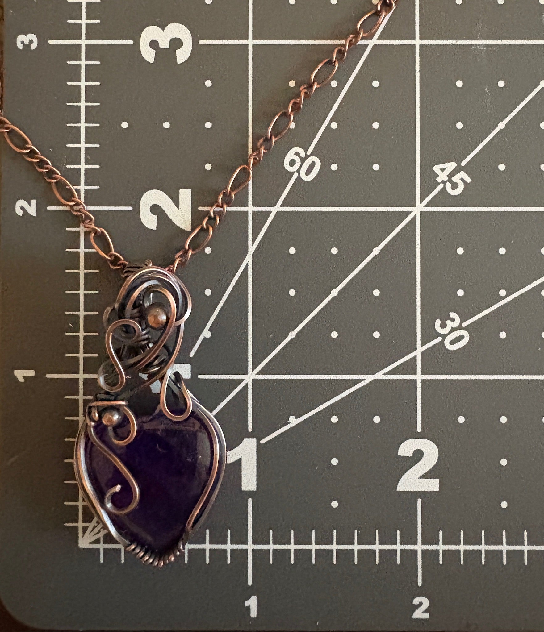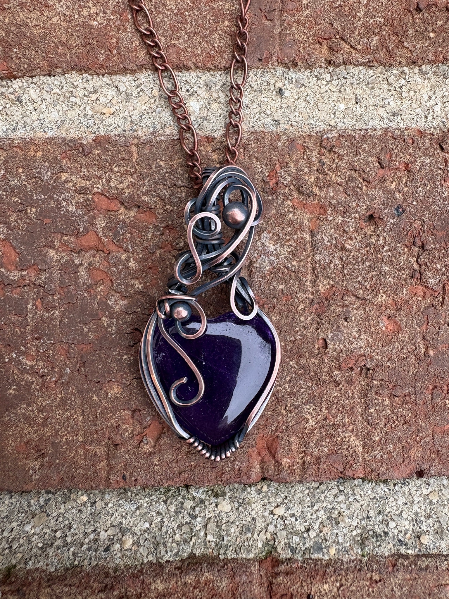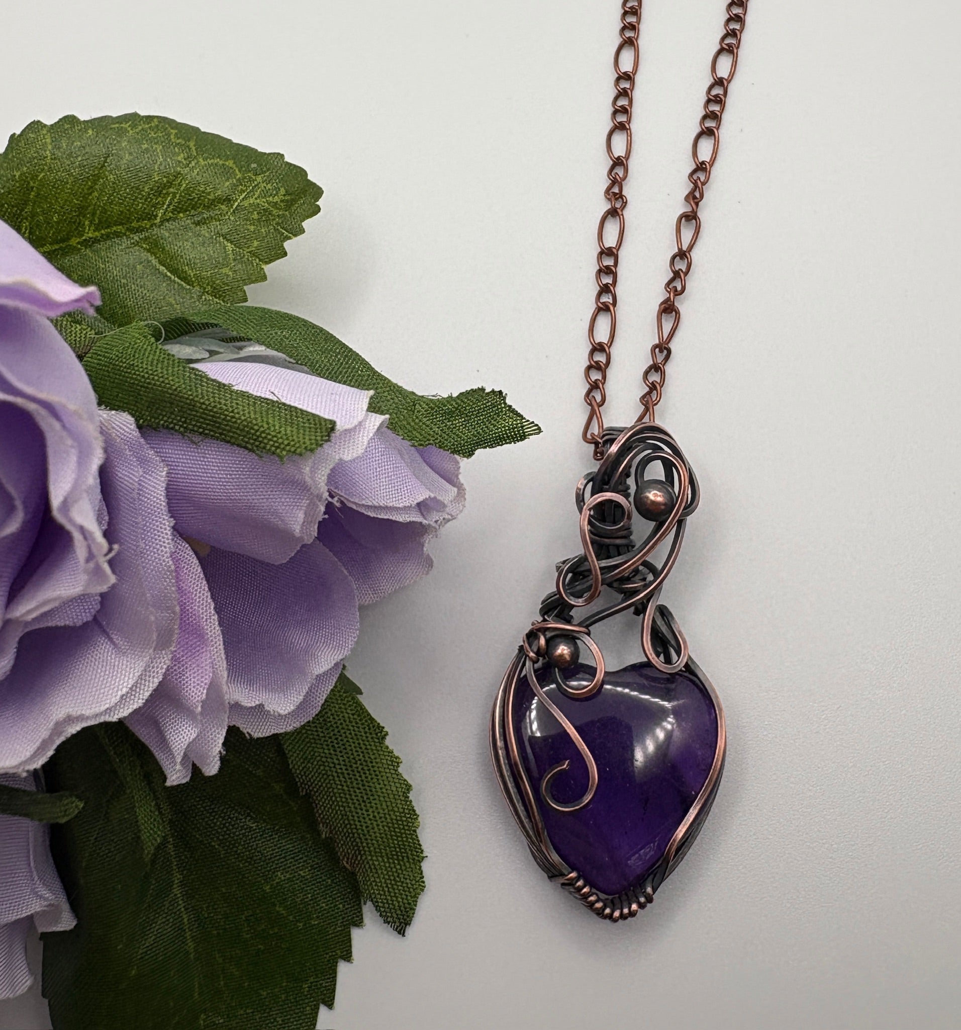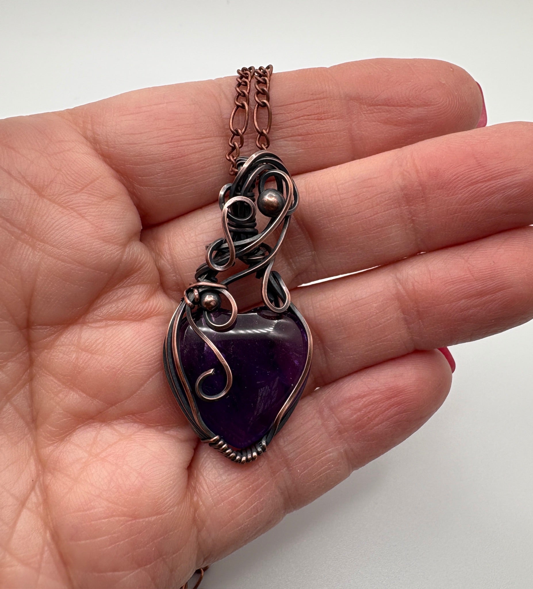 Amethyst heart shaped stone wrapped in swirly oxidized copper wire and adorned with copper beads. A gorgeous and simple design to upgrade any outfit! The pendant is 1.75 inches tall and .75 inches wide. It comes with a free chain!