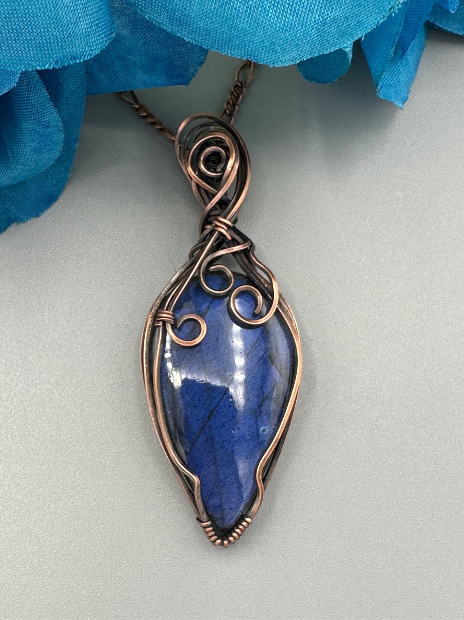 Stunning Labradorite teardrop stone wrapped in oxidized copper wire to give it an antique look. Adorned with a rose motif in front of the bail and swirly wire on the top of the stone. Pendant is 2.75 inches tall and 1 inch wide. Comes with a free chain!