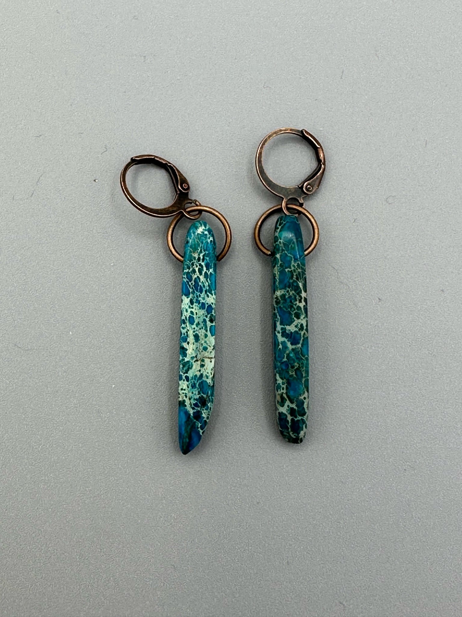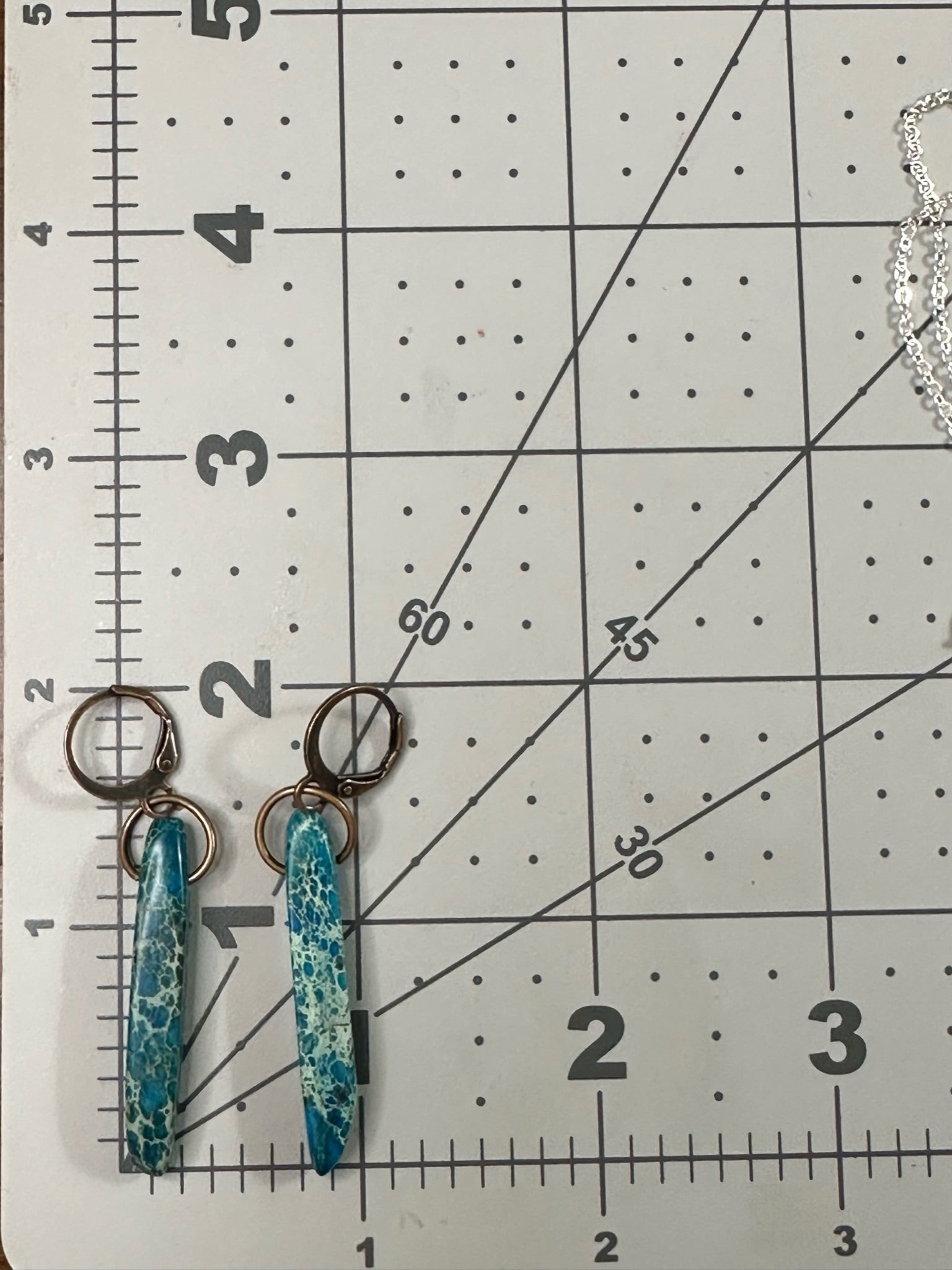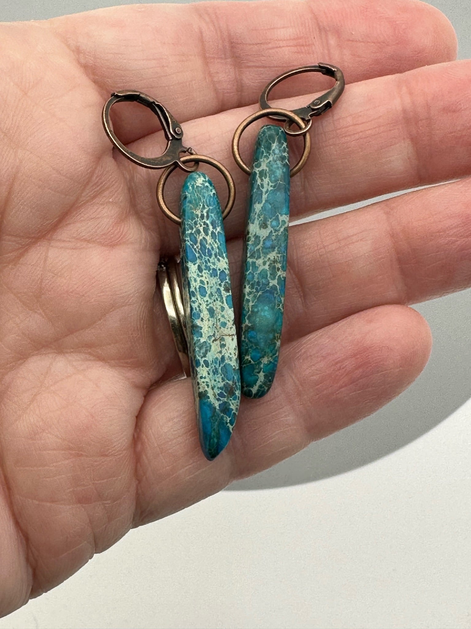 Turquoise colored Megnasite earrings with round lever back hooks. Earrings dangle 1.5 inches and are .25 inches wide. Gorgeous minimalist earrings that are unique and stylish! Megnasite is a magnesium carbonate with the same crystal structure as calcite.