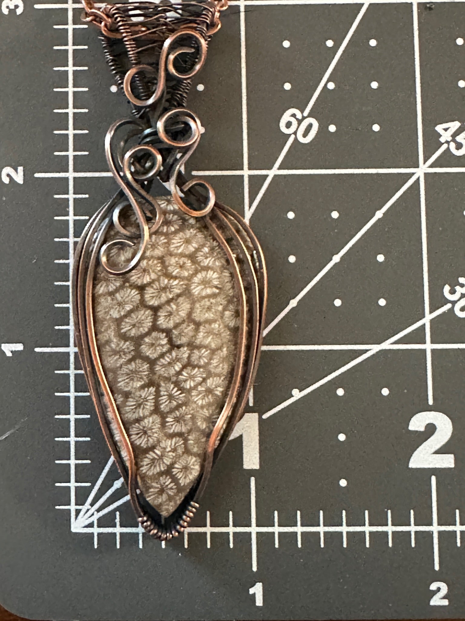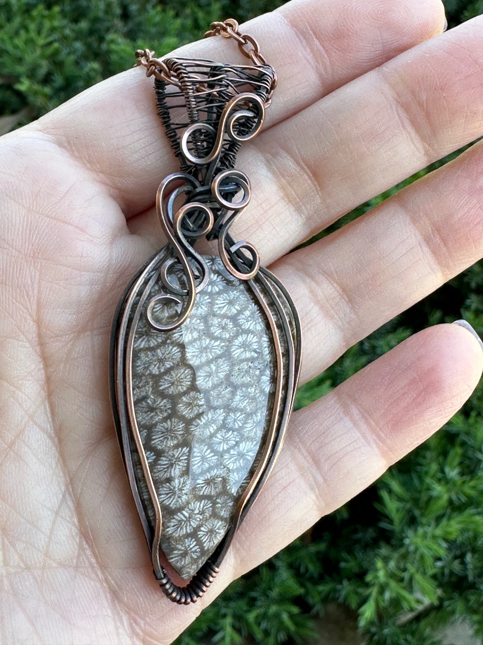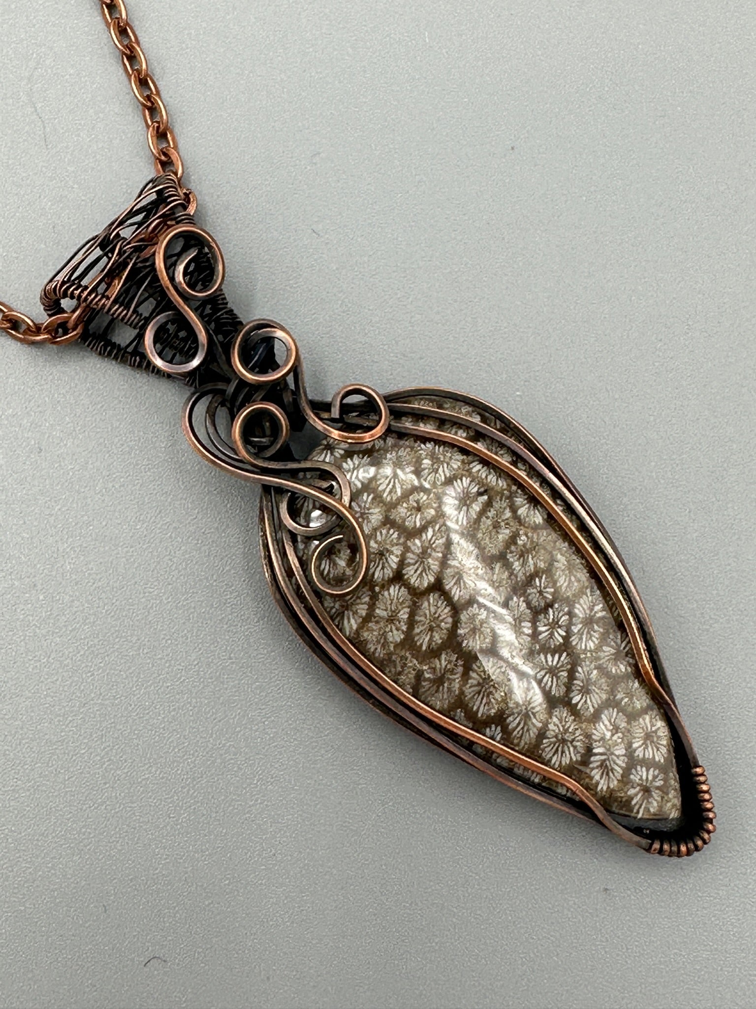 Natural Fossil Coral teardrop pendant wrapped in oxidized copper wire to give it an antique look. This pendant features a wire weaved bail with swirls on top. Pendant is 3 inches tall and 1 inch wide. Comes with a free chain!