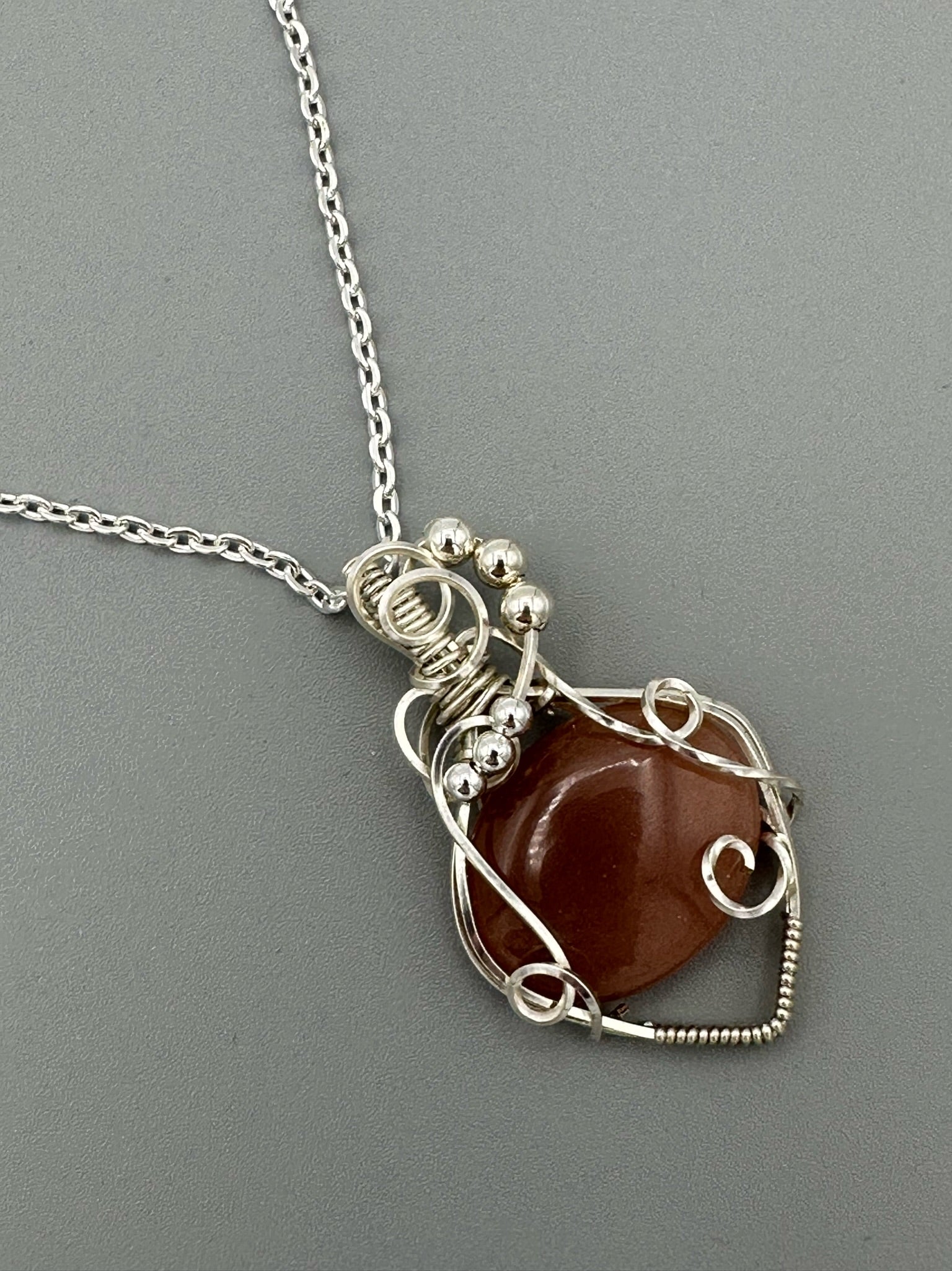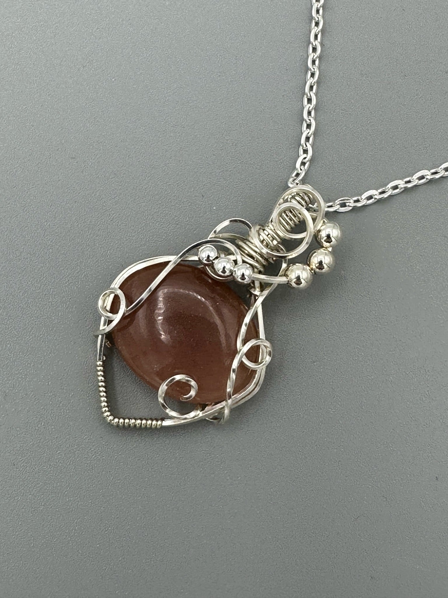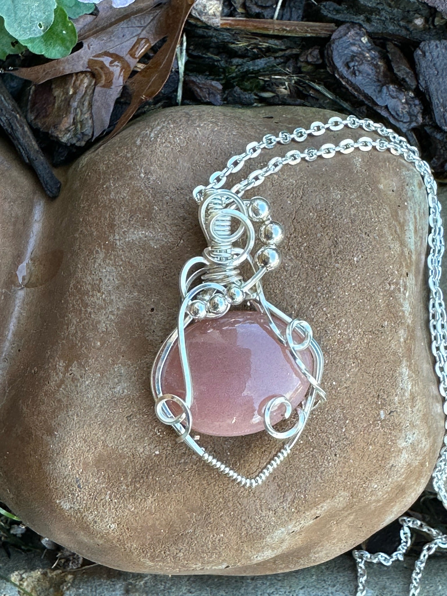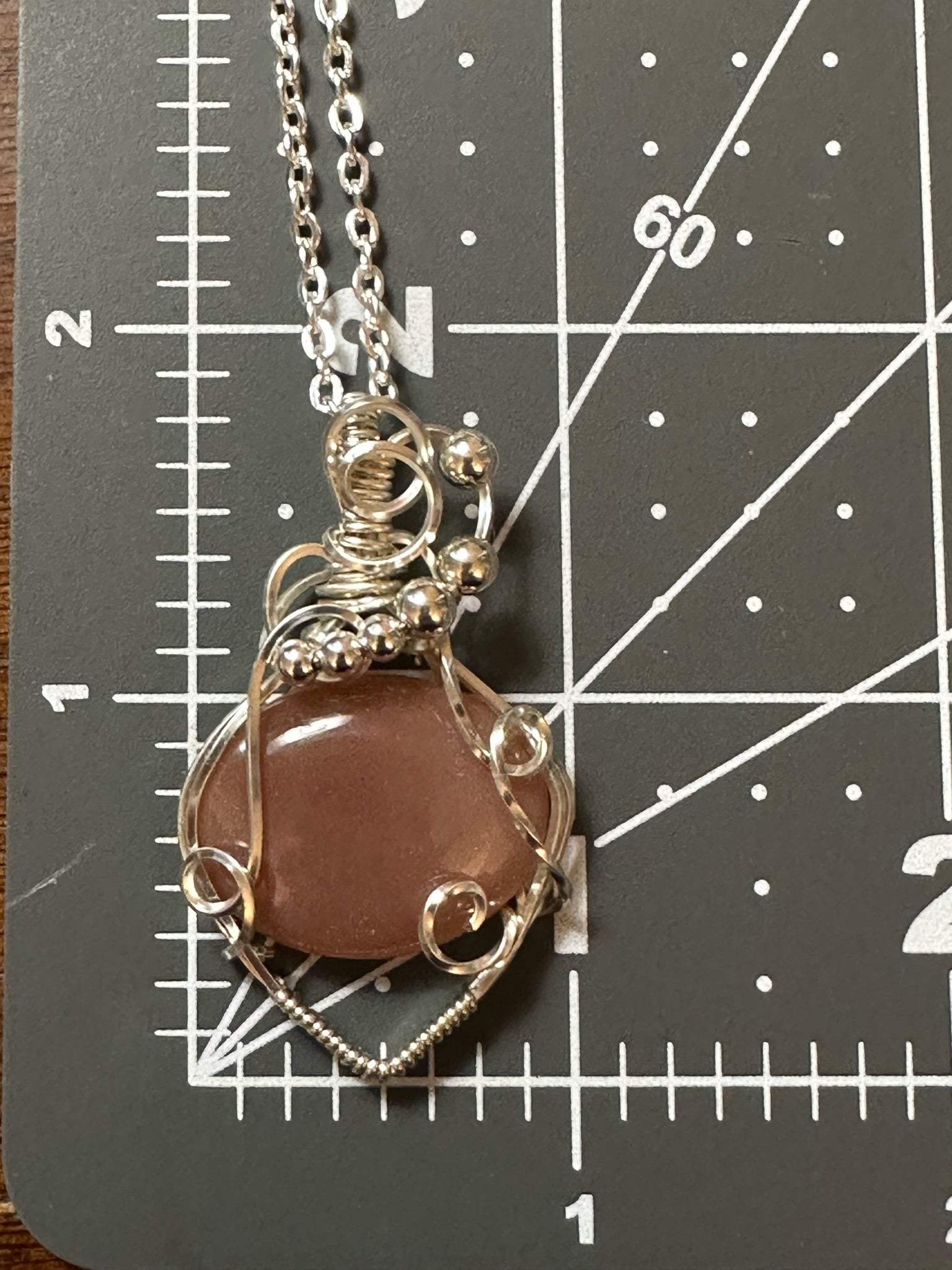 Pretty peach moonstone wrapped in silver plated wire. Features twisted square wire and silver beads. Pendant is 1.75 inches tall and 1 inch wide. Comes with a free 18 inch chain!