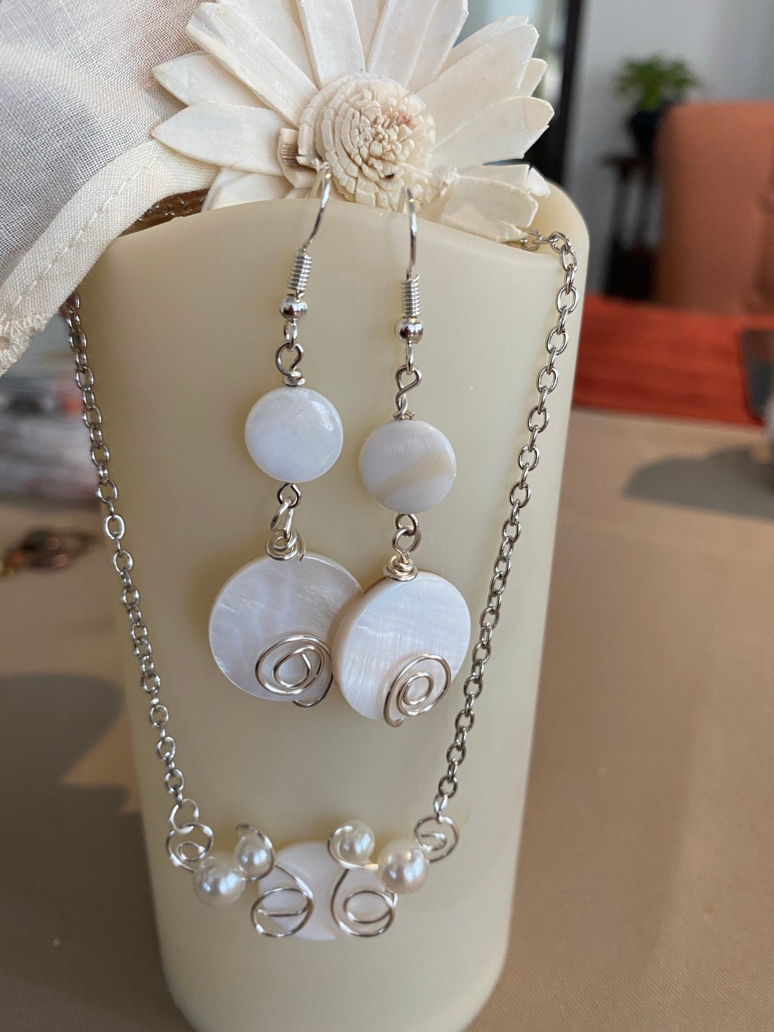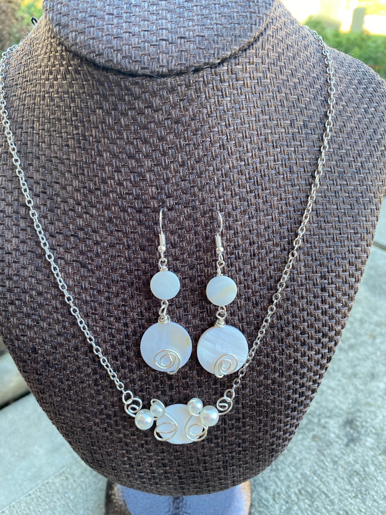 It's a set! Cute and fun ivory flat circle discs wire wrapped with lots of spirals and twists make a great gift. Matching dangle earrings with ivory pearl beads and French hooks makes it a set! The necklace comes with a chain and is packaged all ready to give as a gift.