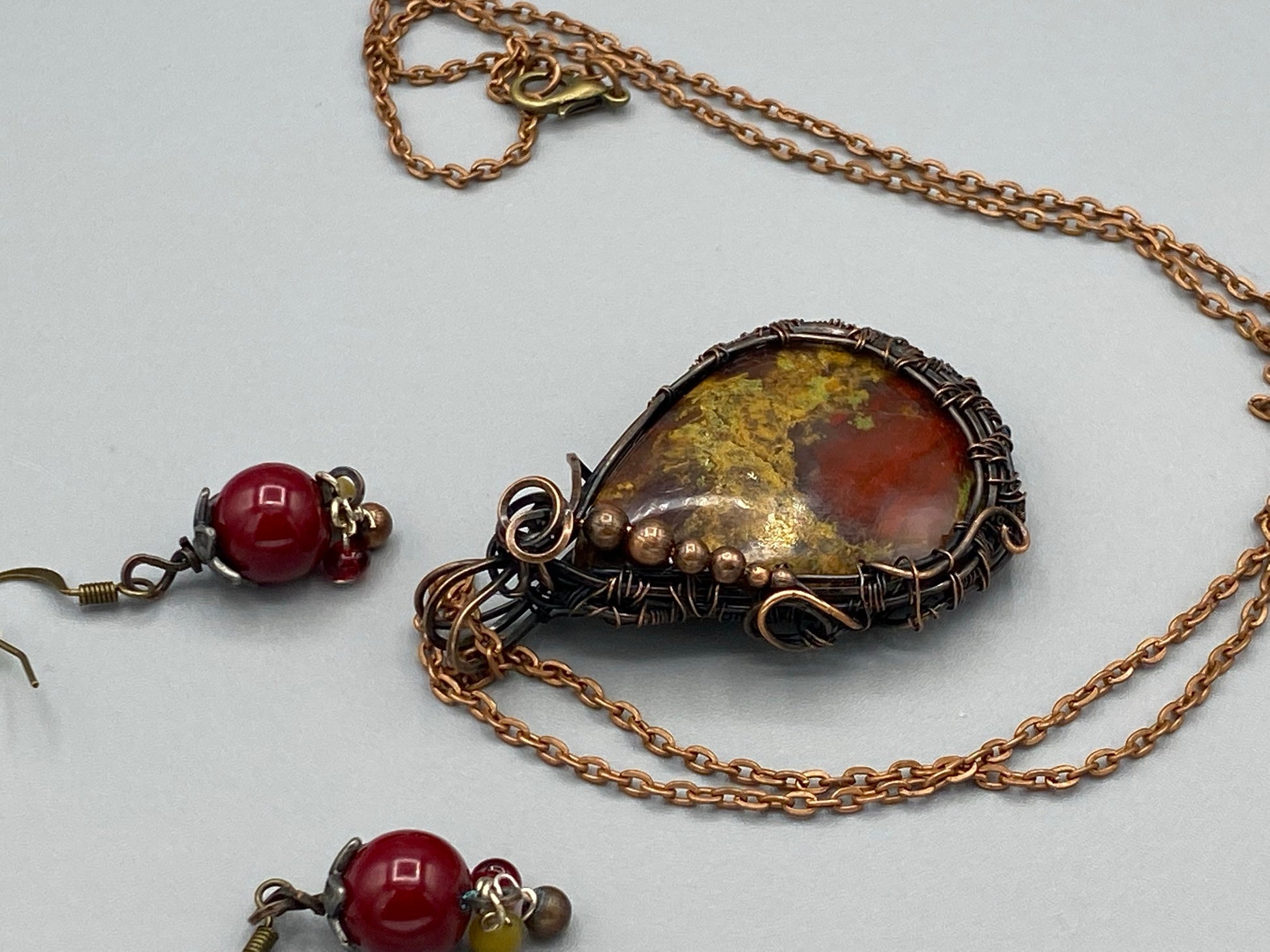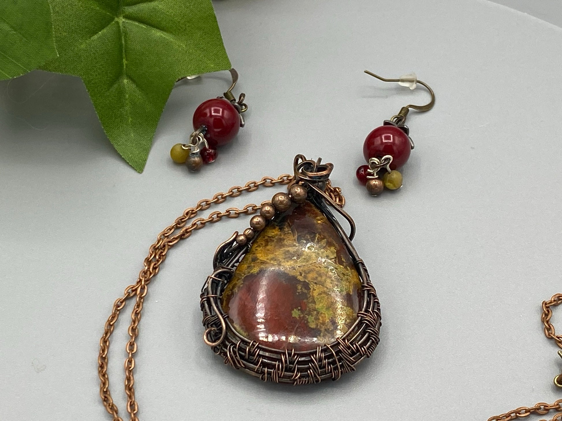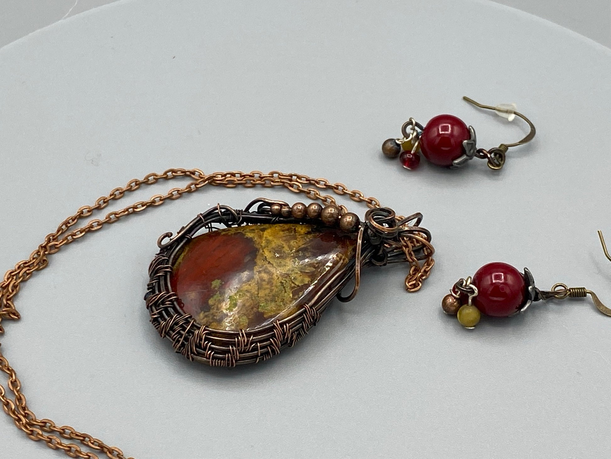 Gorgeous burgundy and olive teardrop stone necklace, wire wrapped in antique copper wire includes matching dangle earrings with clusters. This set would make a sweet gift for someone special!