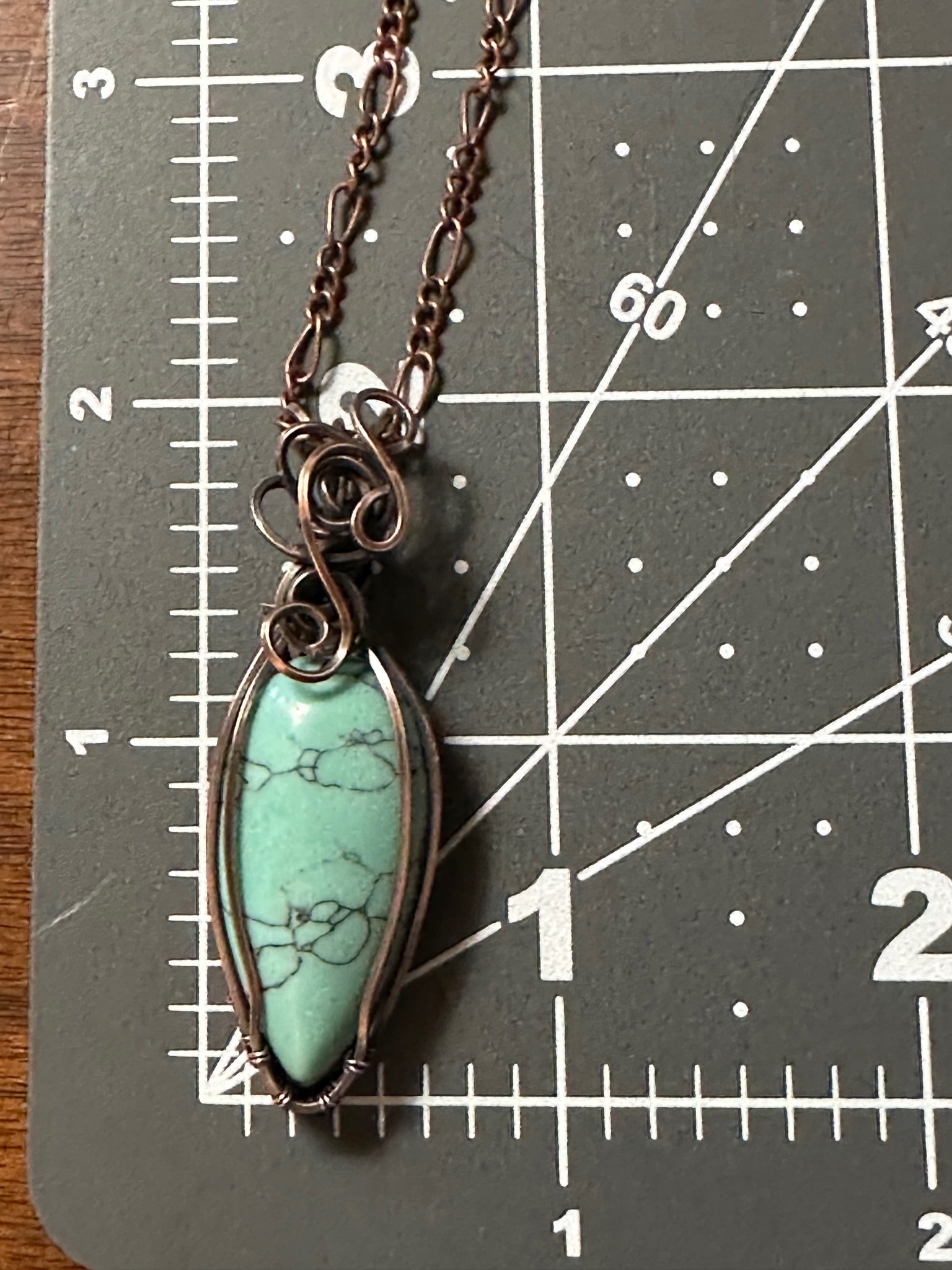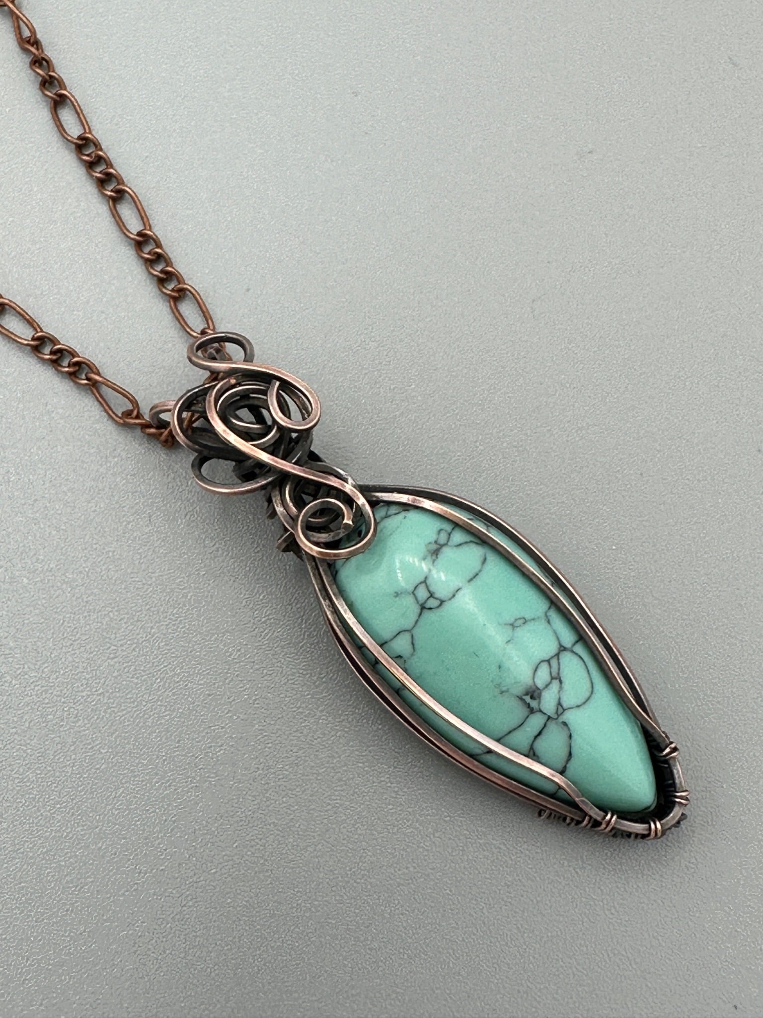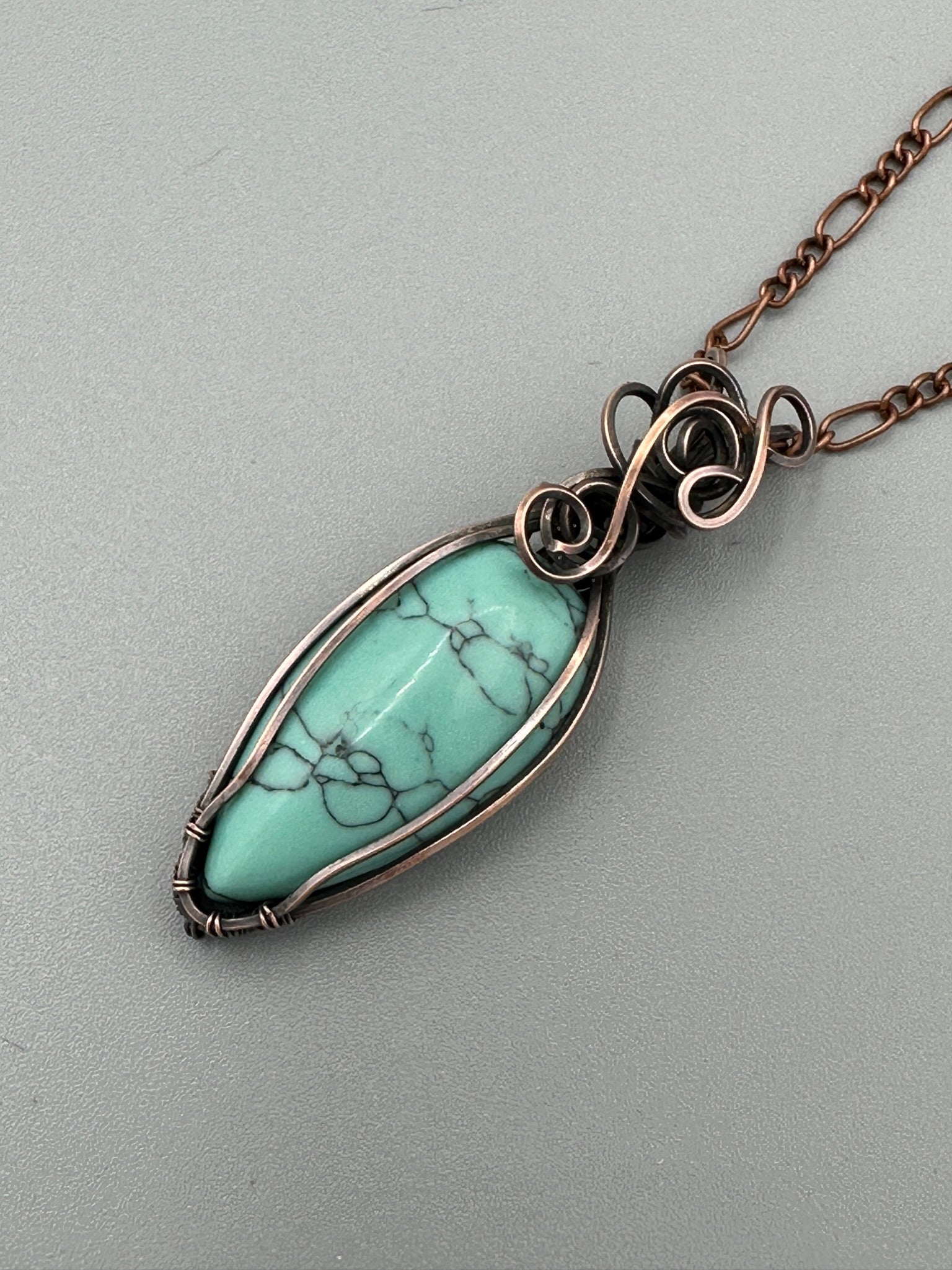Beautiful synthetic turquoise pendant wrapped in oxidized copper to give it an antique look. Features swirly square wire on the top of the bail. Pendant is 2 inches tall and .5 inches wide. Comes with a free chain!